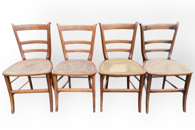 A set of four C19th French style fruitwood chairs with flared backs and curved rails above cane seats, raised on slight sabre legs joined by stretchers. (4)