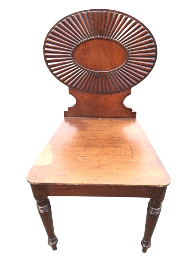 A C19th mahogany hall chair with oval ribbed back above a waisted support, with flared rectangular seat raised on turned tapering legs.
