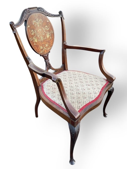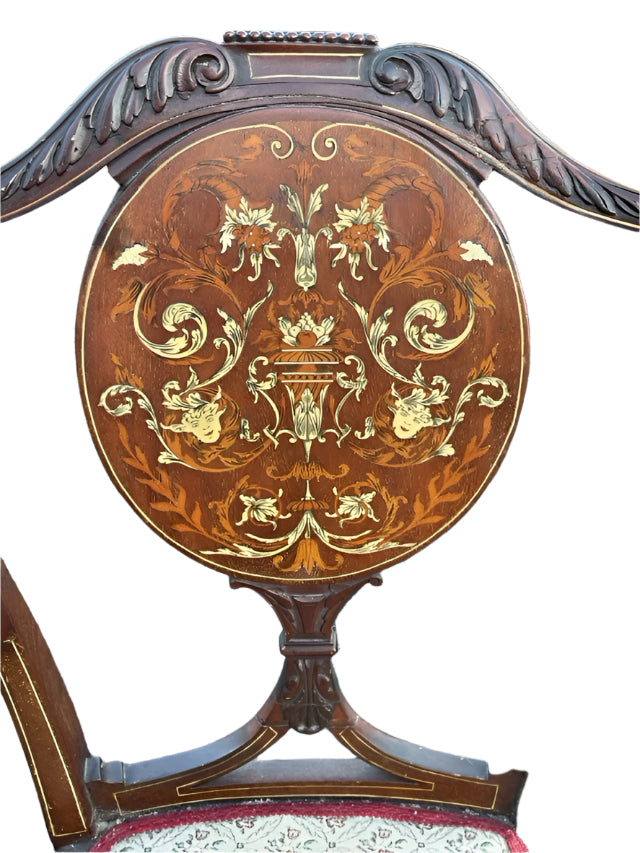 Edwardian mahogany parlour armchair with foliate scrolled carved arched crestrail and oval elaborate renaissance style arabesque inlaid splat, above a serpentine fronted upholstered seat flanked by outscrolled arms, raised on cabriole legs.