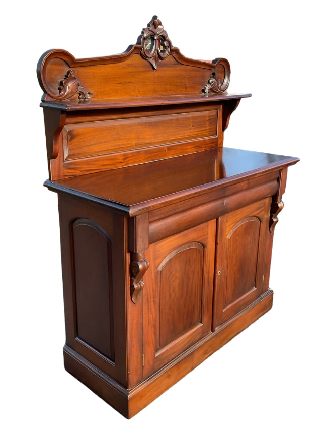 Victorian style mahogany chiffonier with pierced foliate carved crest above a panelled back with scrolled carving and shelf, the rectangular top over a pair of moulded frieze drawers and arched panelled doors, on a plinth. (47.25in x 19.75in x 61in)
