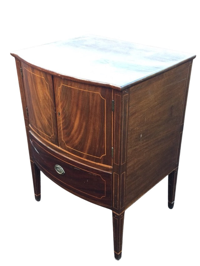 A Georgian mahogany bowfronted cabinet with a pair of boxwood strung doors and a conforming drawer mounted with navette shaped brass handle, raised on square tapering legs. (22in x 18.5in x 29.25in)