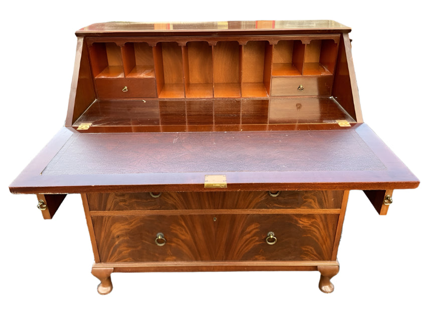 A Georgian style mahogany bureau with fallfront on lopers enclosing a leatherette skiver, drawers and pigeonholes, above four brass ring handled drawers, raised on cabriole legs. (36.5in x 18in x 38.5in)