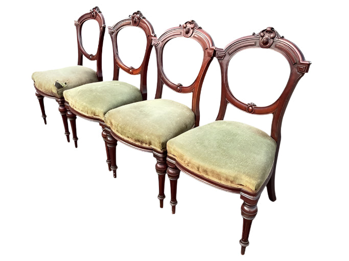 Set of four mahogany balloon-back style dining chairs with scroll carved crest rails and sprung upholstered seats, raised on turned tapering fluted legs. (4)