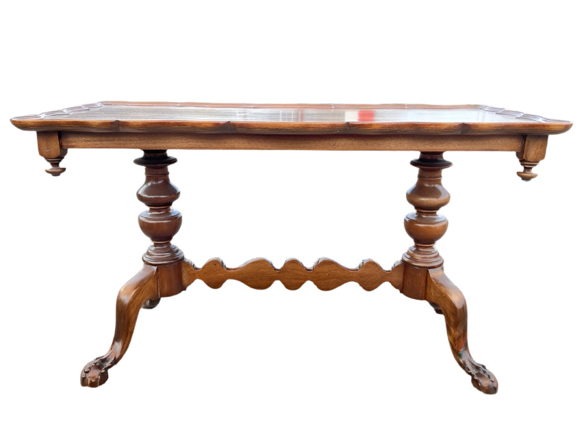 Victorian style mahogany coffee table with waved edge tray top on twin turned supports, raised on cabriole legs with ball-and-claw feet, joined by a rippled stretcher. (35in x 17.5in x 19.75in)