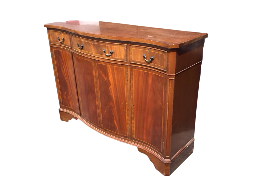 Georgian style mahogany serpentine fronted cabinet with crossbanded top above three brass handled frieze drawers and four doors, raised on bracket feet. (49in x 16.5in x 35.25in)