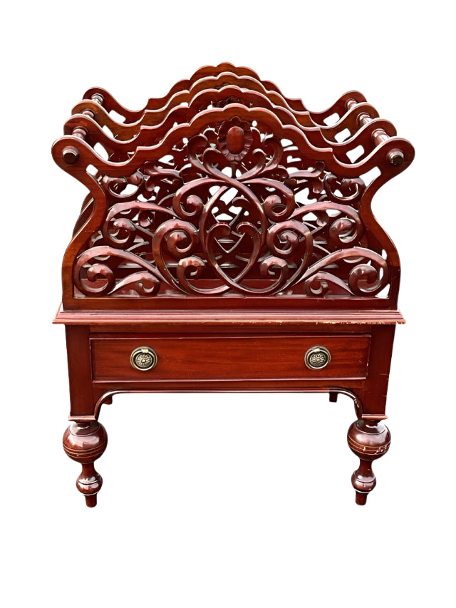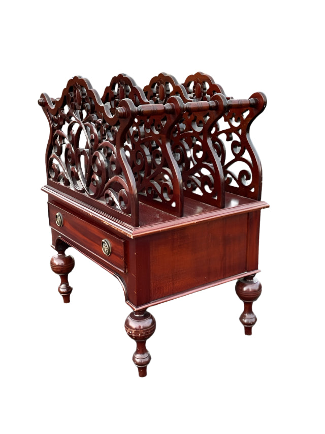 Victorian style mahogany three division canterbury with arched scalloped and scrolled pierced dividers above a brass handled cockbeaded drawer, raised on turned legs. (21.5in x 16.25in x 28in)