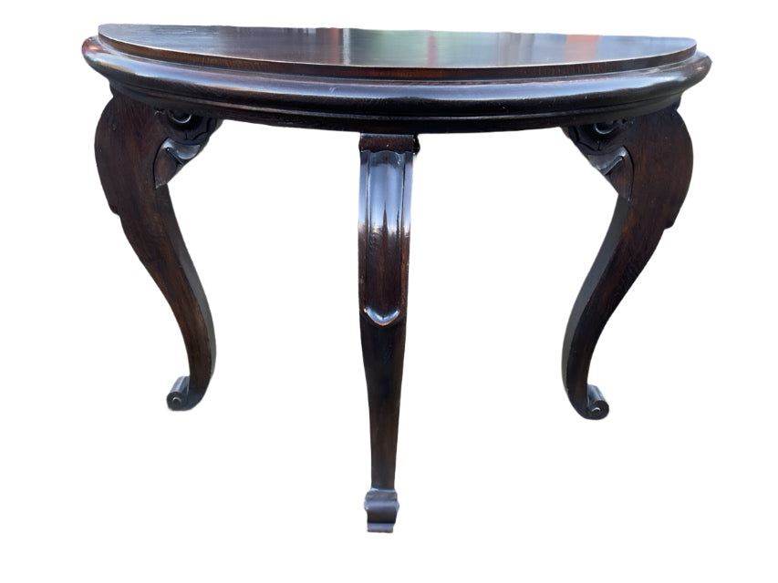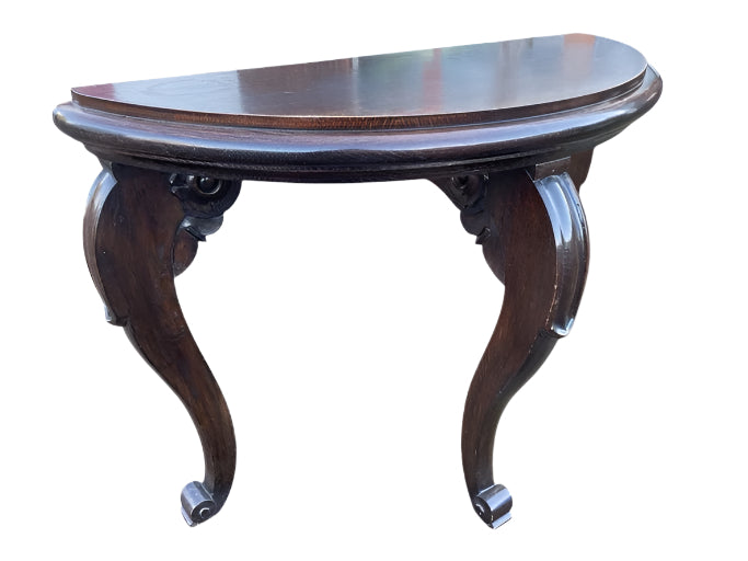 Victorian style oak demilune console table with moulded top raised on carved cabriole legs with flowerhead roundels, leaf carved knees and scrolled feet. (46in x 18in x 33in)