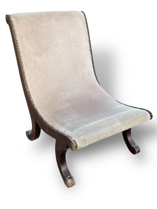 A regency style upholstered mahogany chair with studded borders, scrolled back and seat raised on sabre legs.