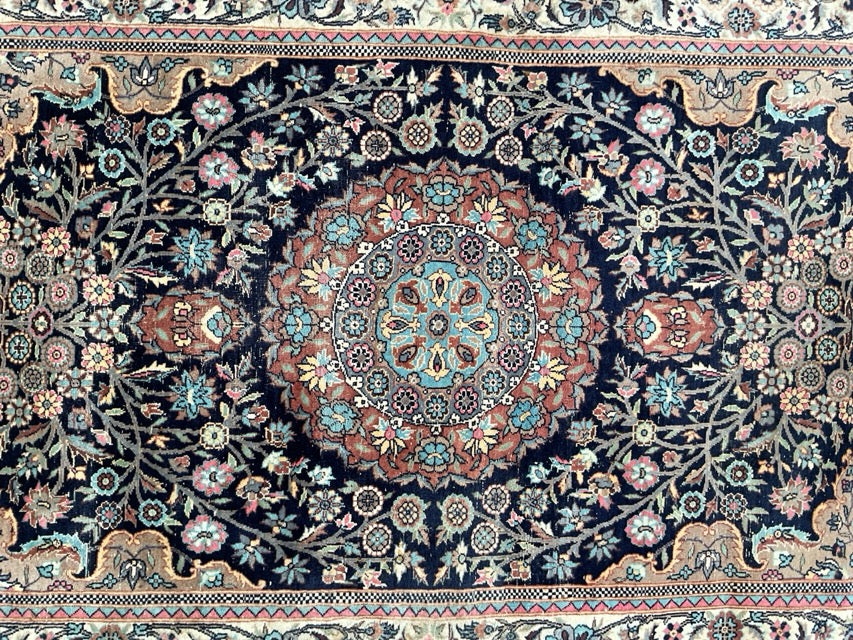 This exquisite Persian rug showcases a captivating design with a central medallion bursting with vibrant floral motifs. The medallion is encircled by meandering branches and delicate floral elements, all set against a deep blue field. The intricate detailing and rich color palette create a truly mesmerizing piece of art. This rug is a testament to the artistry and craftsmanship of Persian weaving. (37in x 63.5in)