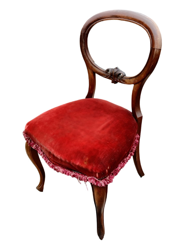 Victorian mahogany balloon back chair with foliate carved rail above a serpentine fronted upholstered seat, raised on cabriole legs.
