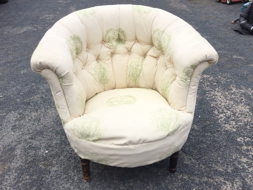 A Victorian tub armchair with button upholstered bow back above a rounded sprung seat, raised on ring-turned tapering legs.