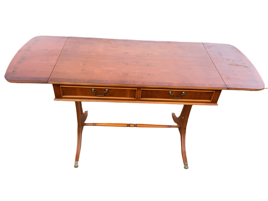 Regency style yew sofa table with crossbanded top and two leaves above two brass swan-neck handled drawers, on pierced splat supports with reeded sabre legs and brass lions paw castors. (57.5in x 21.5in x 29in)